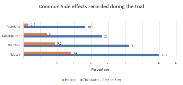 Tirzepatide's overall safety profile in SURMOUNT-3 was comparable to that of the SURMOUNT and SURPASS trials, which were previously published. In SURMOUNT-3, gastrointestinal-related adverse events were most frequently recorded, and they were typically mild to moderate in severity. 2.1% of participants using a placebo and 10.5% of persons getting tirzepatide discontinued their trial therapy due to adverse events.